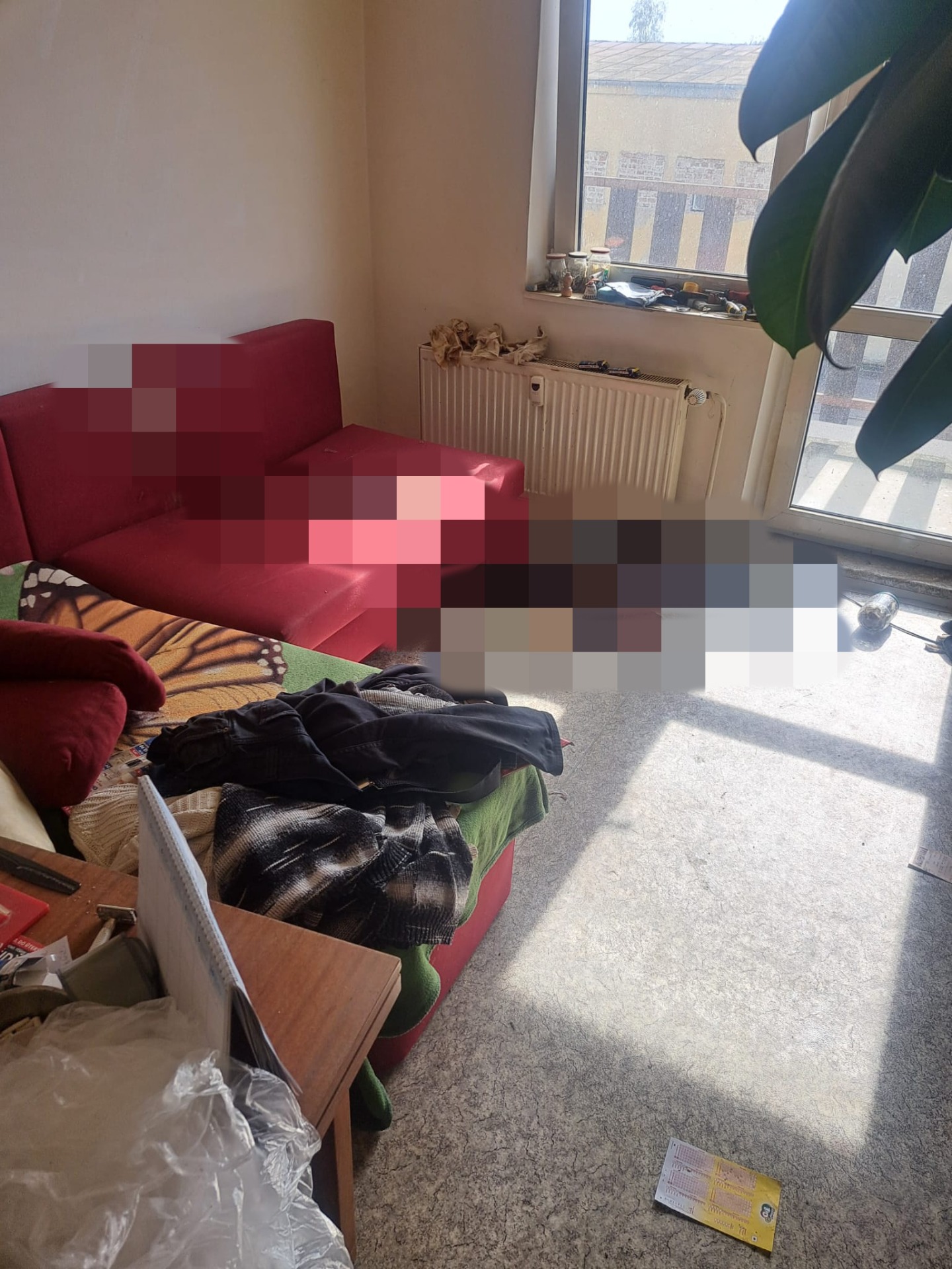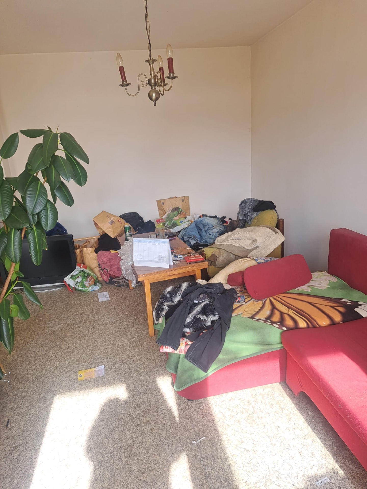 Obývací pokoj působil jako místo, kde se odehrával běžný den. Sedačka byla pokrytá dekami a oblečením, na stole ležely papíry, drobnosti a věci osobní potřeby. Televize stála na zemi, tašky s nákupem zůstaly nerozbalené, některé věci byly odložené bez zjevného důvodu – přesně tak, jak to člověk dělá doma, když už nemá energii všechno řešit.
